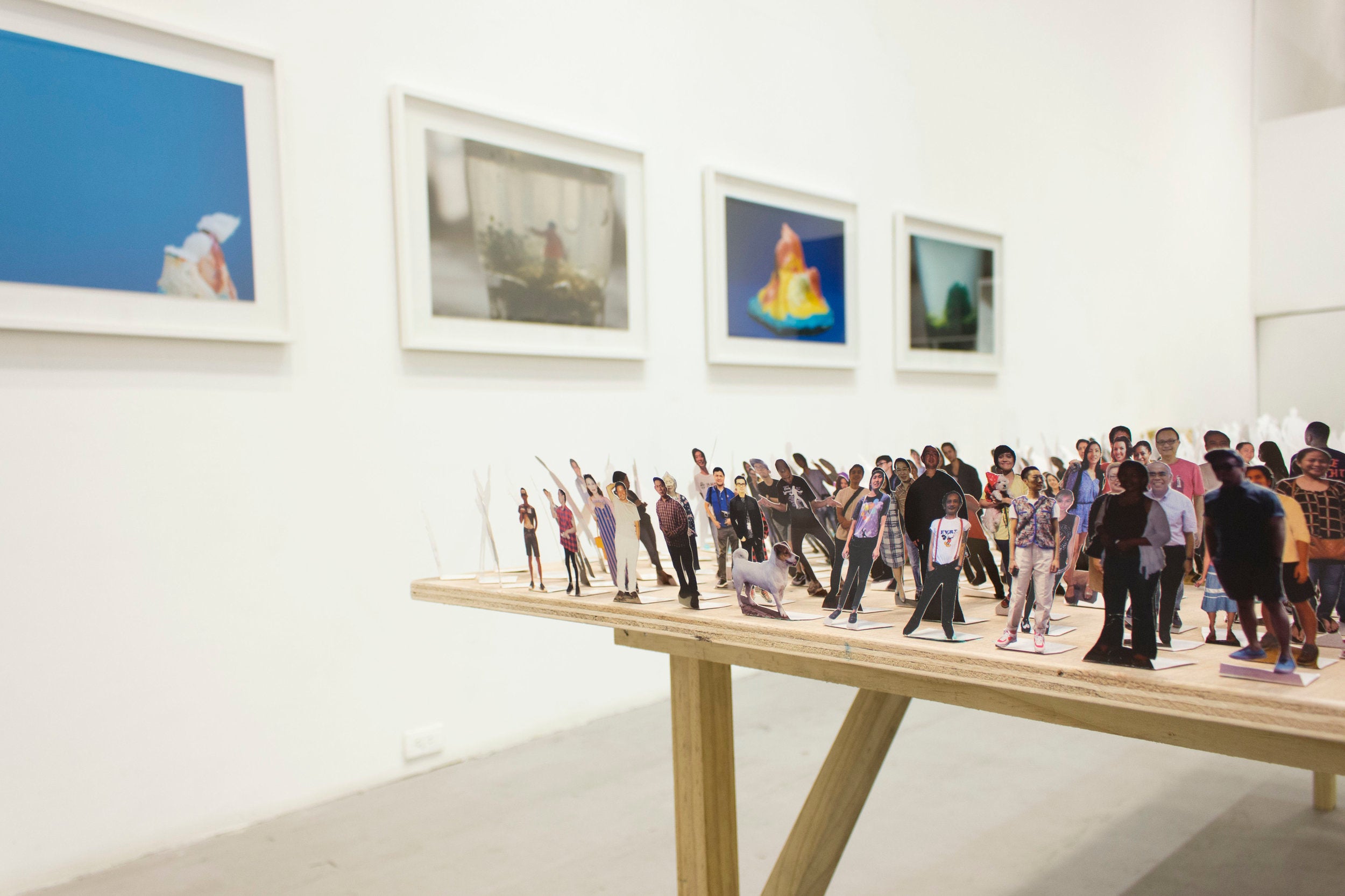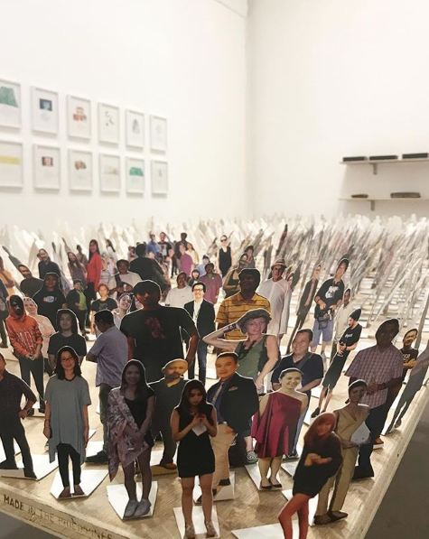 A third edition of her past installation, Pindrops – mini standees or cutout photos of people in the art scene, shows a diverse group of people she encountered. The people she knows in the art scene tripled in twelve years. The first edition, shown in 2006 at the CCP 13 Artists Awards exhibit, included 200 people. The current edition shown this year 2018 includes 600 people. This may be an indicator of the expansion of the art scene and her scope of engagement in it. The first edition was made with photos she herself took at a time when there were no smart phones and before Facebook. The third edition shown in this exhibition includes some people she has not met and only sees on social media. Some of the pictures were grabbed online.
