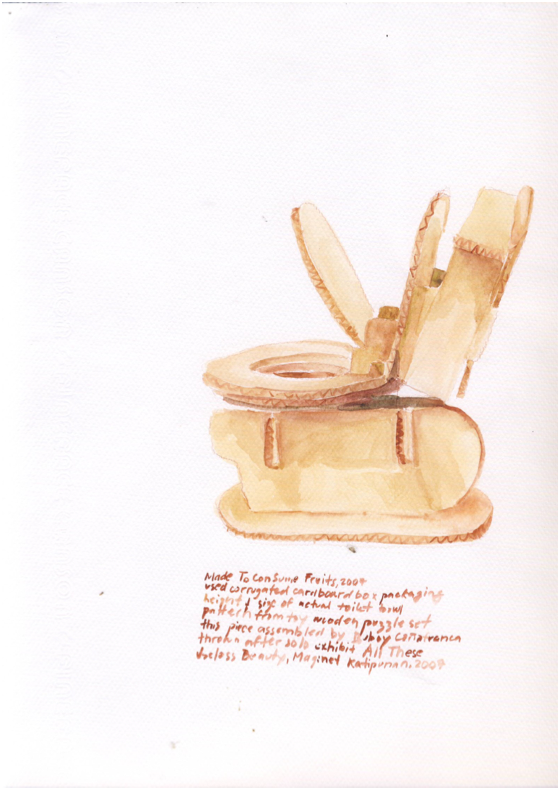Putting the anarchy of memory in order, Lena Cobangbang archived her artworks from the past that perished, were forgotten, or went missing. Based on photographic evidence or memory, she painted the artworks on paper using watercolor, a medium as tenuous as trying to remember. Like memory, watercolor paintings act like stains and faded documents. They look like pale traces of the actual event, a vague semblance of the genuine experience, tinted forms of real objects.