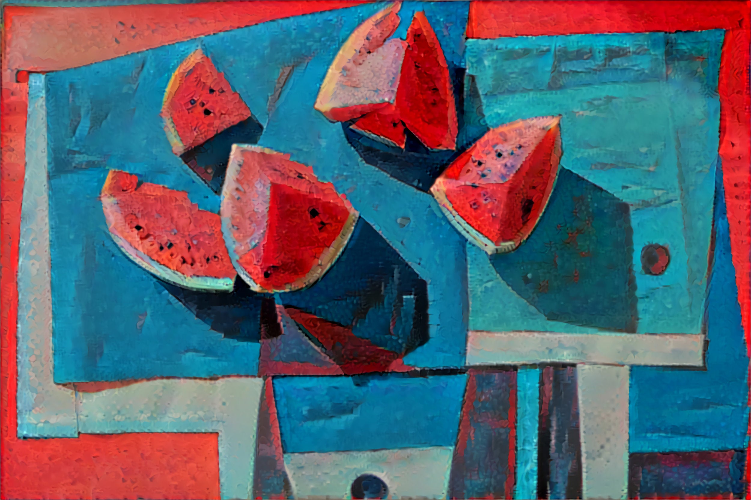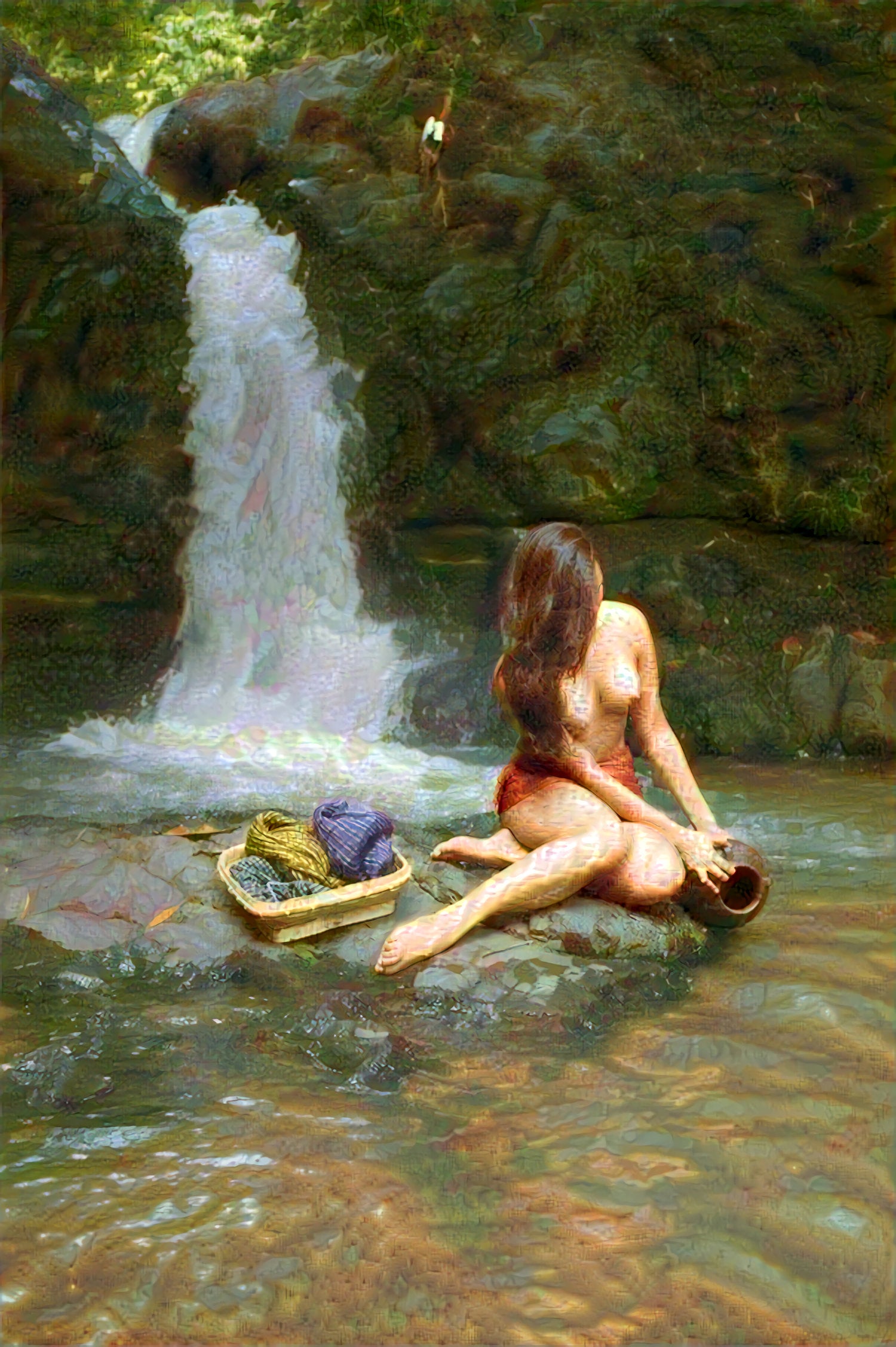 This eye, a combination of software and hardware, feeds data to a confident, self-determining brain-like programme, an artificial neural network, that provides us with an image that is so keenly self-aware of its pixelated provenance, and yet also so fastidiously obedient to protocol. Thus a typical Amorsolo composition--- re-staged, photographed, “thought through” this neural network and made to accumulate layer upon layer of color, texture, shape, and line--- feels and looks convincingly like an Amorsolo. Thumb, image, brain and eye conspire towards a relentless likeness; a representation fabricated from a machine's (un)erring mind. The speed by which an artificial brain could produce a classico-romantic Bathing Beauty would've pleased the enterprising National Artist. -
