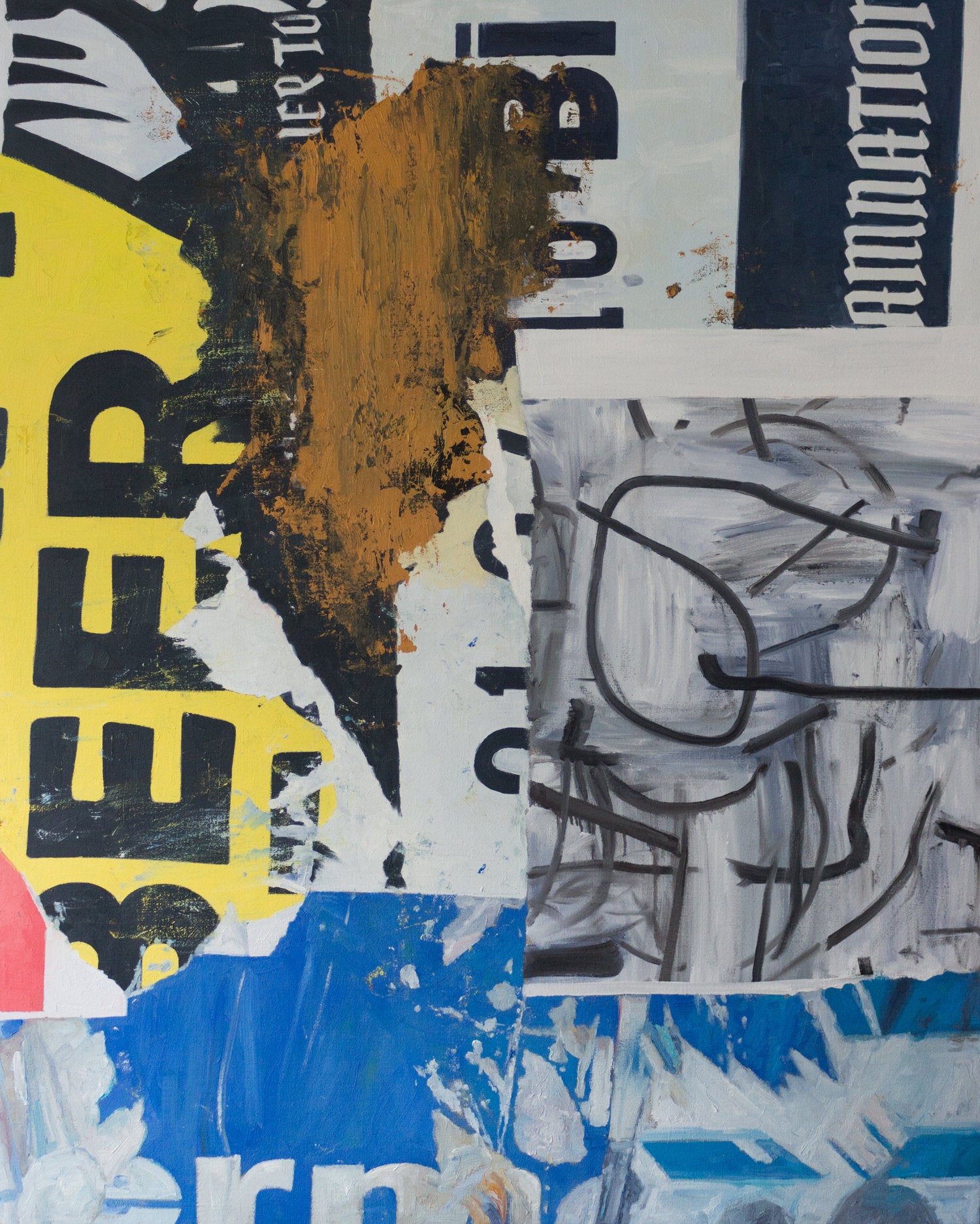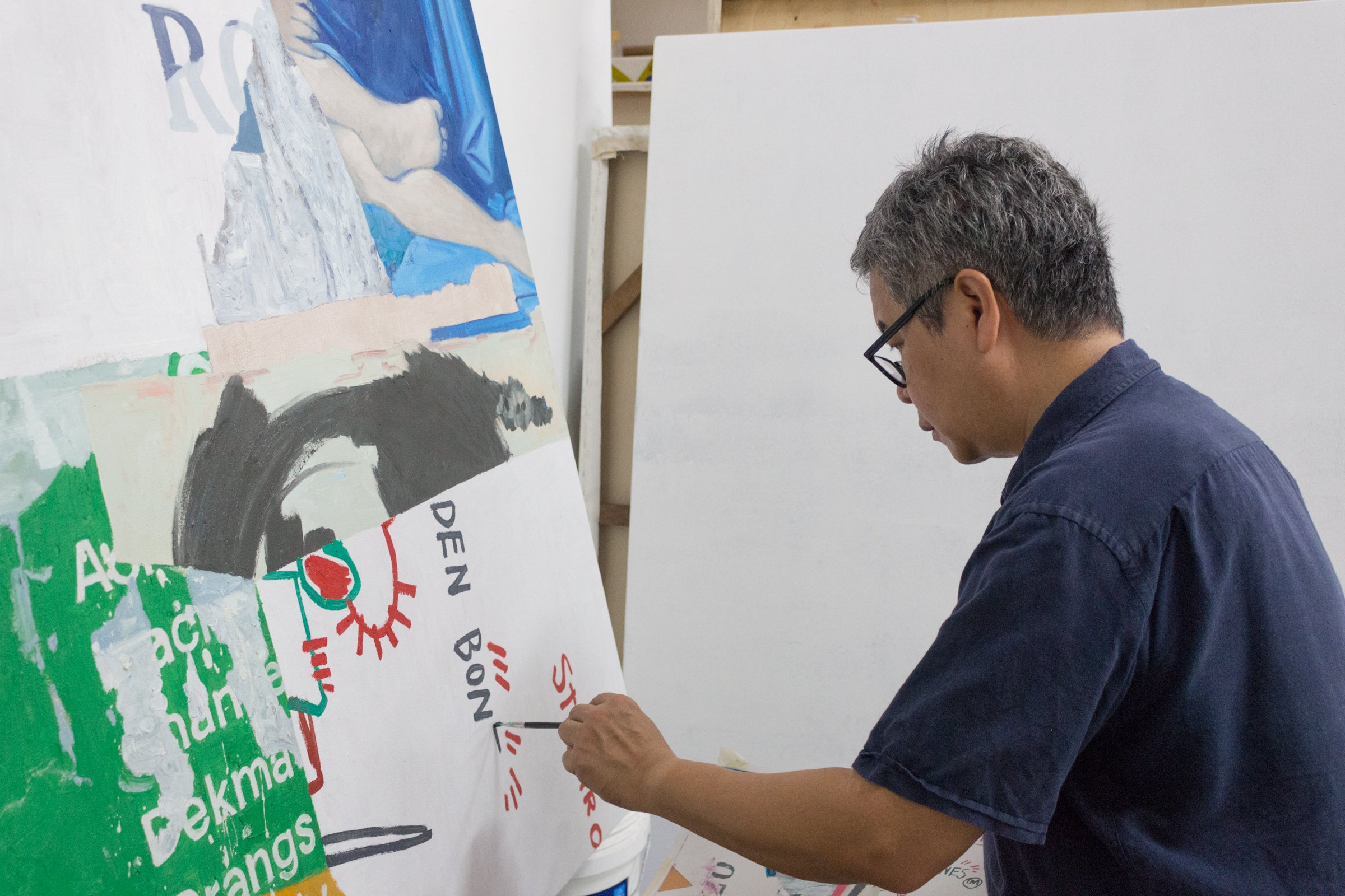 Peeling off entire sections and strips of billboards layered over the other during several encounters, Tan reconfigures these as new collages inside his studio. He proceeds to make large paintings based on selected collages from this collection, rendering their surfaces, texts, and shapes into larger painterly expressions.