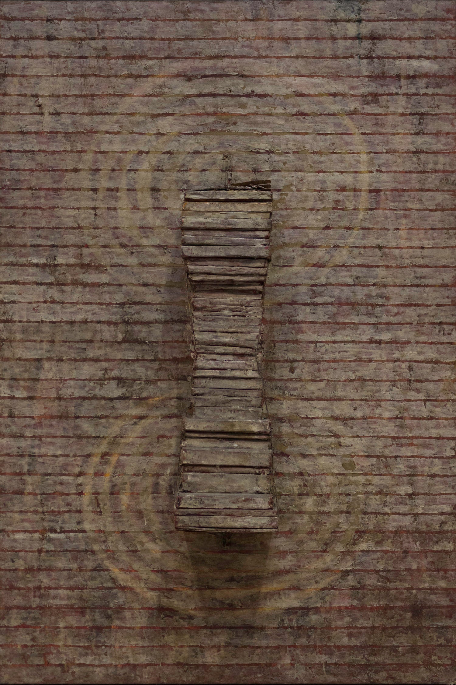 Marks on preparatory drawings are sometimes translated into actual objects as in Head to Wall (1995/2004), wherein he attached a stack of books in the center of a single encaustic panel as an attempt at a more defined iconography. First shown as part of the Painting By Numbers exhibition curated by Chabet at the Cultural Center of the Philippines in 1995, the work is based on a drawing of thickly applied red and tan enamel paint on paper. The blown up painting lures the viewer in through the central relief of books and the concentric circles radiating from each end, creating a labyrinthine inscription from which the viewer cannot escape. He describes it “like the force fields on opposite ends of a magnet, or a bridge between portals leading out of a plane. It is a body with strong opposing forces in stasis, immobilized, with no definite direction.” Nearly ten years after it was created, he returned to the work for his solo exhibition Sleep at West Gallery in 2004, painting it over with white bands as a way of reclaiming it from the aggression of the original image.