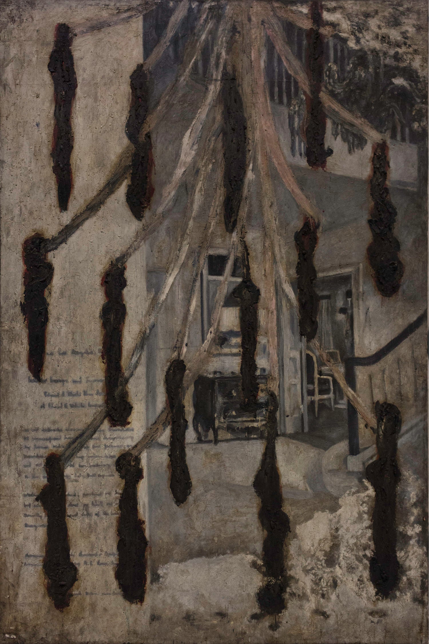 Like many of Chabet’s students, Jet also used found images, apart from his own drawings, as a basis for his paintings. Placebo (1996) is a two-panelled work based on a photograph from Architectural Digest magazine, which was included in the Dangerous Metaphors exhibition also curated by Chabet at The Art Center in SM Megamall in 1996. Jet recalls looking at the black and white images of formally decorated houses, thinking they were devoid of warmth and human presence. He painted over the page, creating a pattern of vertical forms in navy and red, each anchored to a common point with gauzy, faint tendrils, which became the basis for one of the panels of the diptych. He added a second panel (now lost) in chalky grey blue acrylic, a color, which he believed emanated the placebo effect of the ‘safe houses’, and extended the work into real space by attaching strips of lace pinned onto an armchair facing the canvas.