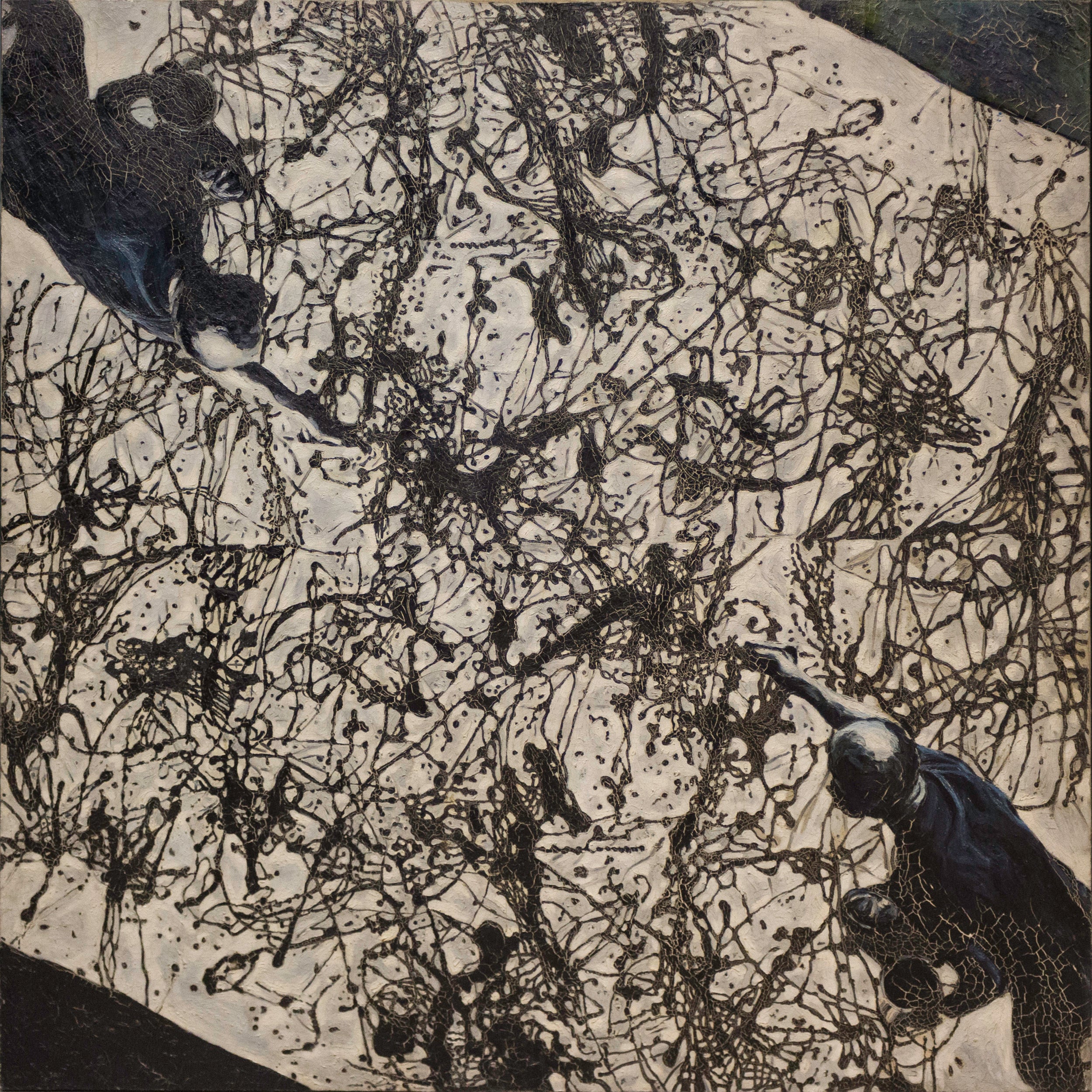 One of his earliest surviving works Arena (1991) is also based on a suite of photographs of Jackson Pollock painting taken by Martha Holmes for Life magazine in 1949. Using found images of art was a way for him to observe and comment on art history. By copying the photograph grid-by-grid, he explained that he “mirrored the artist in the act of painting so that he appears to be in battle with his own image. Copying the splatters meticulously contradicts the visceral spontaneity of action painting, transforming it into a cerebral and deliberate image-making.” Originally exhibited as a floor piece for the Figures of Speech group exhibition at Alliance Française in 1991, the work continues to mesmerize with its web of fine lines, which is accentuated even further with the tangle of cracks that have erupted on its surface.