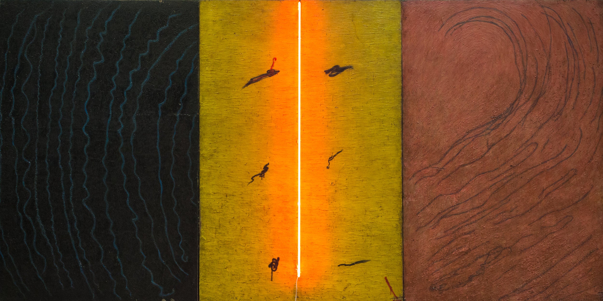 In Jet’s case, these serial exercises initially served as a form of visual diary, wherein he could unload and wrestle with the thoughts of the day. As they accumulated they acquired an impetus of their own, becoming an outlet for further experiments with surface, color, texture, objects, materials, and processes, such as encaustic, which was hardly done at that time. The use of hot wax in the encaustic process can already be seen as an interesting allegorical amber that entraps painting itself. In Poppy Field (1995), he assembled a large triptych of black, yellow and dark pink encaustic panels incised by a slightly quivering red neon light originally patterned after a hand drawn line. The painting was based on drawings using ballpen, crayons and oil pastel on ordinary colored paper. Part of the Measure and Metaphor exhibition curated by Chabet at The Art Center in SM Megamall, the painting is named after his psychedelic punk band and can be likened to a hallucinogenic landscape, with its rippling, impressionistic marks that expand and tremble across the surface of the three panels.