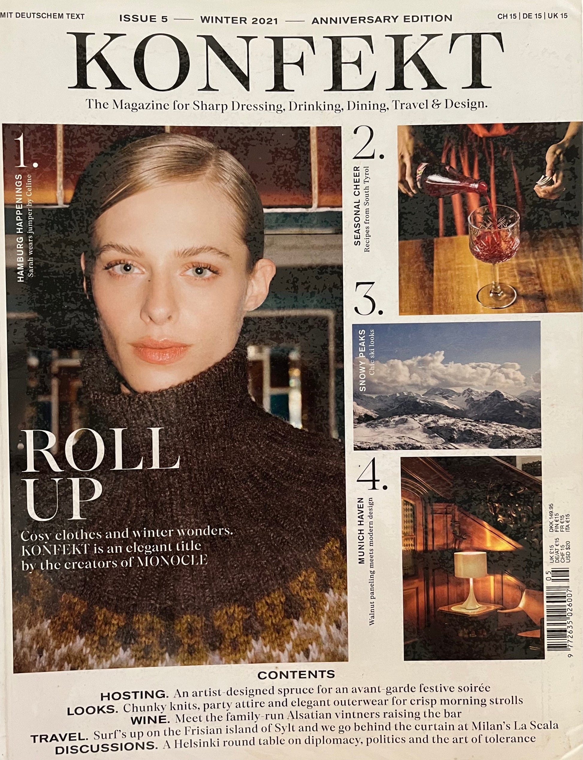 Issue five of Konfekt is a celebration of wintering well, from where to travel for frosty fun to what to wear and cook this season. We're outdoors snow-shoeing, riding horses and swimming off Frisian beaches; then revelling in cosy interiors, recipes for seasonal feasts and trimming Christmas trees with an artistic twist. Elsewhere, we take you behind the scenes at Milan's historic opera house, meet jewellers and fashion designers making things their own way and join an insightful round-table discussion in Helsinki. From city shopping to rejuvenating spas, join us for Konfekt's joyous winter journey.