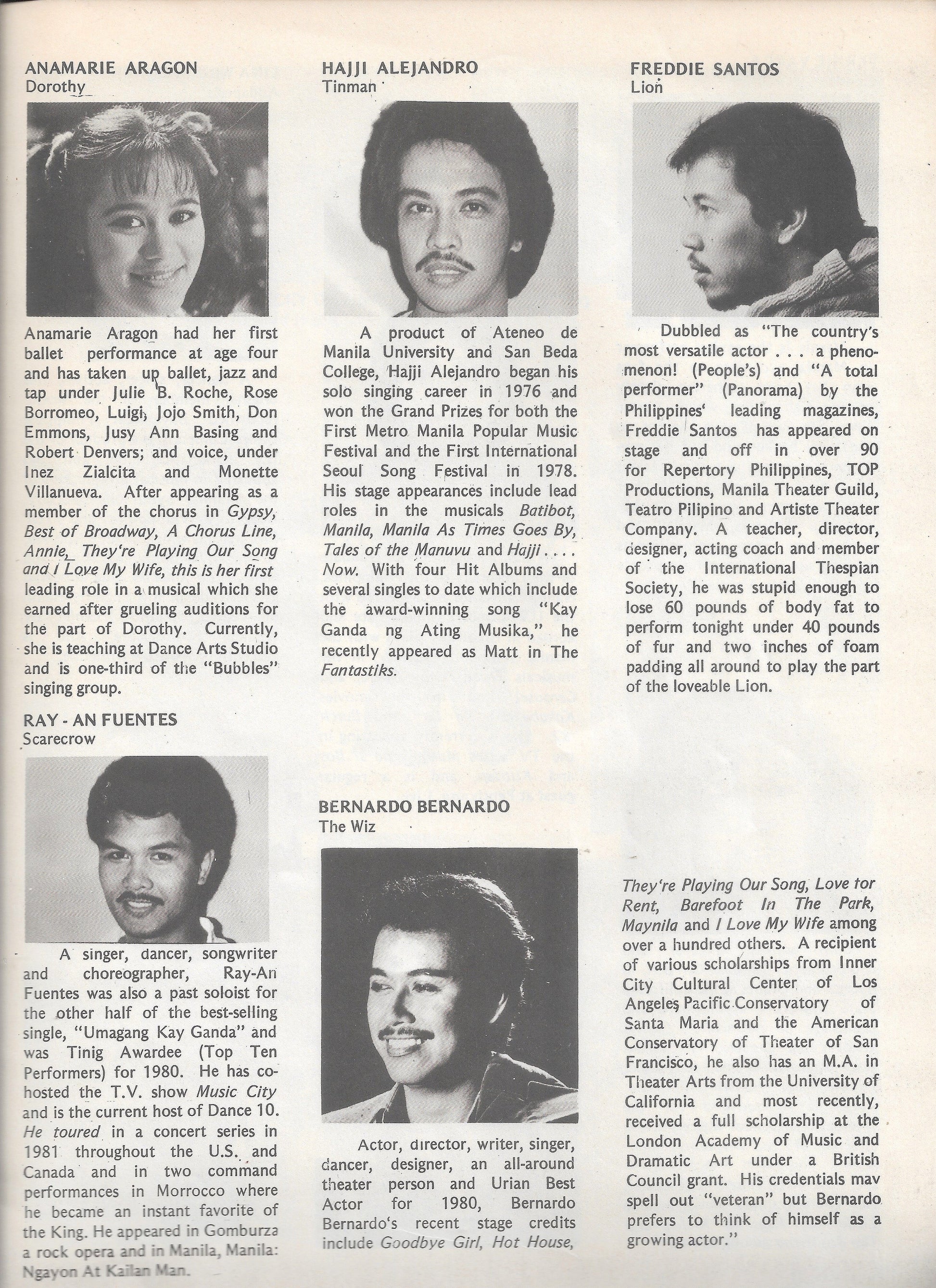 On August 13, 1982, The Wiz premiered at the CCP Main Theater, reimagining the beloved classic The Wizard of Oz. This Filipino production brought together a stellar cast—Anamarie Aragon, Vernie Vergara, Haji Alejandro, Freddie Santos, Ray-An Fuentes and Bernardo Bernardo, who directed the production and starred as The Wiz.